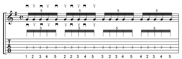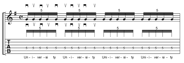 PG Masterclass Workshop 2von Hansi Tietgen Mit freundlicher Unterstützung von MarshallQuintolen und mehrvon Hansi Tietgen Nachdem wir uns in der ersten Ausgabe unserer Masterclass-Serie mit einem sehr effektiv einsetzbaren High-Speed Lick beschäftigt haben, widmen wir uns heute (und in der nächsten Folge) einem heißen rhythmischen Schmankerl: den Quintolen. Und die Dinger haben es wirklich in sich, schließlich liegt die gitarristische Herausforderung der "krummen Teile" gleich auf zwei Ebenen: der rhythmischen und der spieltechnischen. Und das riecht nach intensiver Nachtarbeit! Aber schau doch einfach selbst. 16tel Triolen sind ein Thema, mit dem die meisten Musiker gerade noch etwas anfangen können. Bei den zickigen 16tel Quintolen sieht es schon ganz anders aus. Hier sind viele Gitarreros sehr schnell mit ihrem Latein am Ende. Das muss aber nicht sein, denn das Ganze ist eigentlich gar nicht so schwer. Einfach gesprochen steht der Begriff 16tel Quintole für die Aktion 5 Töne in dem Zeitraum zu spielen, in dem im Normalfall eine einzelne Viertelnote klingt