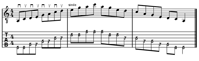 Pentatonic Improvisation Part 1 Seite 3Wenden wir uns also der Praxis zu. Um dir die bestmögliche musikalische Unterstützung angedeihen zu lassen, haben wir dir einen ziemlich coolen Jam Tack aufgenommen. Er wird dich bei deinen ersten Exkursionen ins Reich der Pentatonik Improvisation unterstützend begleiten . Es lohnt sich also, das Teil einfach schon einmal herunter zu laden und dann geht es gleich schon weiter! Power Jam - Jam Track abspielen So, jetzt wird es ernst. Nein, keine Sorge! Ganz so schlimm wird es nun auch nicht. In unserer ersten Übung beschränken wir uns auf das schlichte Rauf- und Runterspielen der ersten Position der A-Moll Pentatonic (siehe auch Folge 1- Die Basix). Achte beim Üben auf eine saubere Ausführung und spiele das Ganze auf jeden Fall im Alternate-Picking Style (Wechselschlag). Übung 1 - Aller Anfang ist leicht - Audio abspielen