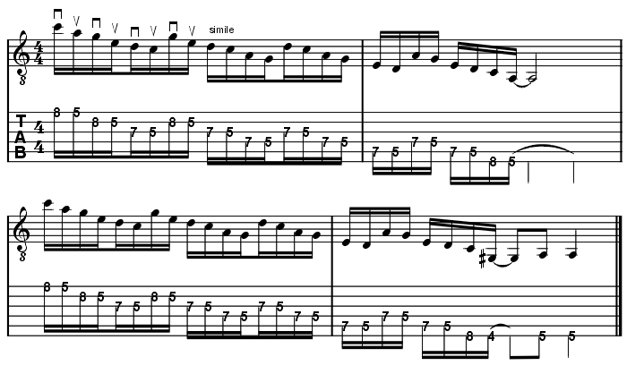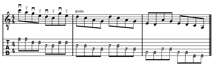 Pentatonic Improvisation Part 1 Seite 4Unser nächster Lick ist schon ein bißchen komplexer und bringt eine gewisse Ordnung ins Up- And Down der Pentatonik. Die Übung startet auf der hohen E-Saite. Vom 8ten Bund ausgehend, spielst du die Tonleiter bis zur G-Saite bergab, gehst zurück auf die B-Saite, spielst von ihr aus drei weitere Saiten runter (B-,G-,D-Saite), gehst zurück auf die G-Saite und begibst dich wiederum drei Saiten bergab (G-,D-,A-Saite) usw. Diese einfache Maßnahme versorgt die Pentatonik mit einem interessanten Sound und erhöht die Attraktivität der Leiter um 100%. Basis-Übung 2 - Audio abspielen