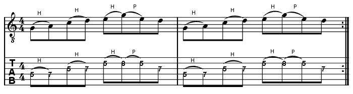 Aber wir haben noch eine zweite Variante auf Lager. Die eingebauten Hammering On's und Pull Off's machen die Übung zu einem lockeren Erlebnis. Falls du noch gar keine Erfahrungen mit dieser Technik gemacht haben solltest, würde ich dir im Moment anraten, dich voll auf das Üben der ersten Version zu konzentrieren. ÜBRIGENS: Grundlegende Übungen zum Thema Hammering On und Pull Off findest du auch in meinem neuen Buch Guitar Action. Jetzt aber los! Basis-Übung 1a