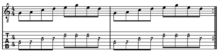 Pentatonic Improvisation Part 1 Seite 2Wie heißt es doch so schön: Erst die Arbeit, dann das Vergnügen. Na, da müssen wir uns dann wohl dran halten. Die nächsten zwei Seiten gehören ganz der Vorbereitung auf zwei spaßbringende Solostudien, die ich passend zu unserem Cool'n Easy Jam Track angefertigt habe. Den Anfang machen wir mit einer relativ simplen Übung. Einem RAUFUNDRUNTER-Lick, der die Freundlichkeit besitzt, sich taktweise zu wiederholen. Trotzdem gibt es etwas zu beachten: Spiele die Linie mit dem sogenannten Alternate Picking, der Wechselschlag-Technik. Starte die Übung mit einem Abschlag und bediene die nächsten Töne kontinuierlich mit dem abwechselnden Einsatz von Ab- und Aufschlägen. Basis-Übung 1 - Audio abspielen