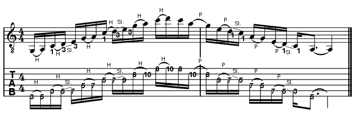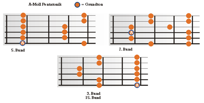 Pentatonic Improvisation Teil 3von Hansi Tietgen Bisher haben wir uns bei unserem Umgang mit der Pentatonik ausschließlich auf das Spielen innerhalb einer Lage beschränkt. Doch das soll nicht so bleiben. Spätestens heute wird sich einiges ändern: Wir führen zusammen- was zusammen gehört: WoW! Das hört sich gut an! Das Werkzeug, das uns den Weg ebnen soll, ist das Sliding. Mit seiner Hilfe gelingt es recht einfach, die Distanz zwischen zwei Tonleiterpositionen zu überwinden. Den gebräuchlichsten Weg wollen wir dir jetzt näher vorstellen. Er verbindet gleich drei Positionen der A-Moll Pentatonik miteinander und ist bei allen Gitarristengenerationen überaus populär. Den ersten Schritt hin zum Oberpfadfinder, machen wir jetzt mit einer sehr puren Variante des Lix. Lerne und staune! Connection Lick - Audio anhören TIPP: Wenn die Hammering On's und Pull Off's in diesem Zusammenhang noch zu schwer für dich sind, kannst du sie natürlich auch weglassen. Sie lassen sich später dann immer noch einbauen. Dein Hauptaugenmerk solltest du beim Üben natürlich auf die Slidings richten. Achte besonders auf den Fingersatz, den wir dir in der Notenzeile dazunotiert haben. Im Groben kann man sagen: Bergauf vollziehst du die Slidings mit dem dritten Finger (Ringfinger). Bergab geht es dann mit dem Zeigefinger (1.) zur Sache. Falls du die Einführungslektion des Workshops versäumt haben solltest und somit die hier verwendeten Skalen noch nicht kennst, ist das kein Beinbruch. Hier sind sie schon: