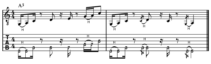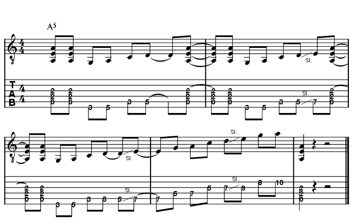 Pentatonic Improvisation Part 3 Seite 2Aber man kann die Pentatonik natürlich nicht nur zum Solospielen verwenden. Auch als Tonlieferant für Rhythmusriffs aller Art, macht die Tonleiter eine verdammt gute Figur. Testen wir das doch mal an. Das folgende Riff verwendet das Prinzip des Connection Licks und kombiniert es mit der unbändigen Kraft eines A Powerchords. Mach mit! Verbindungspower - Audio anhören