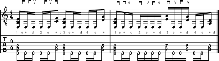 Den Einstieg in die Praxis machen wir jetzt mit einem straigth rockenden Riff, das ausschließlich mit Achteln und Vierteln arbeitet. Außerdem kommt unser geliebter Haltebogen zu Ehren.