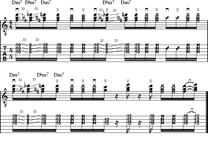 Wie du siehst (und hörst) kommen auch in unserer nächsten Studie "Scratches" zum Einsatz. Aber das ist noch nicht alles. Den eigentlichen Kick bekommt das Riff durch das geschickte "Streuen" von Slidings. Man nennt das verwendete Spielprinzip übrigens "Chromatische Umspielung". Der Hauptakkord ist natürlich nach wie vor das "Dm7" auf der "1". Durch entsprechendes "Sliden" in den neunten Bund und zurück in die Ausgangsbasis, gebe ich dem Riff einen interessanten Anstrich, ohne dabei Gefahr zu laufen das es irgendwie krumm klingen könnte. Dass, das nicht der Fall ist liegt einzig und alleine am Tempo der Aktion. Würde ich nämlich längere Zeit auf dem "Dbm7" stehen bleiben, könnte es schon passieren, dass es den Zuhörern die Schuhe auszieht! Und das muss doch nicht sein, oder?!