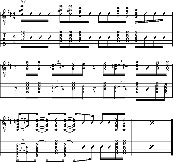 Auf der "3" des zweiten Takts kommen dann wieder unsere "Offbeat 16tel" zum Einsatz. Das Ending des Riffs gestaltet ich mit erneuten Scratches und einem coolen Hammering!