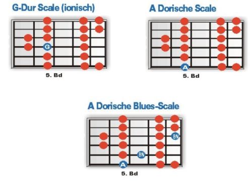 PG Scale Zone Dorische BluestonleiterDas die Moll-Pentatonik und ihre Spielart, die Blues-Scale, zu den wichtigsten Tonleitern des Rock/Pop/Jazz Biz gehören, hast du ja bereits in einer der ersten Ausgaben der PG Scale Zone erfahren. Im heutigen Zone-Update wollen wir uns mit einer Variante der Skala auseinandersetzen, die durch ihren extrem flexiblen Sound in der Lage, ist so unterschiedliche Gitarristen wie Metal-Head Kirk Hammett, oder Latino-Guru Carlos Santana gleichermaßen gut zu bedienen. Name der Wunderwaffe: Dorische Blues-Scale. Die Basis der dorischen Blues-Scale bildet die - na was meinst du?! Genau, die Blues-Skala. Den Zusatz "Dorische" erhält die Skala durch die hier verwendeten optionalen Tönen. Sie entstammen einer Scale, die auf den illustren Namen "Dorische Tonleiter" hört. Detailliertere Infos zu der coolen Skala, erhältst du in einem unserer nächsten SZ Updates. Die Zusatztöne verleihen der Blues Scale einen "weichen", bluesigen Sound und machen sie ganz nebenbei auch noch besser spielbar. Viele High-Speed Blues Lix von Kollegen wie Satriani, Vai und Co. arbeiten mit der Scale. Aber auch Carlos S. oder Brian May sowie diverse Blues-Heroes haben ein Abo auf den Einsatz der Skala. Die wichtigen Basis-Infos zum Thema Dorische Blues-Scale haben wir dir in einer unserer beliebten Flash-Animationen zusammengefasst. Rekapitulieren wir noch einmal: Durch das Erweitern der A-Blues Scale mit der gr.9 und gr.13 entsteht die A Dorische Blues-Skala. Man kann das Ganze aber auch anders herum angehen und sagen: Das Ergänzen der A Dorische Tonleiter mit der Blue Note macht sie zur A Dorische Blues Scale.
