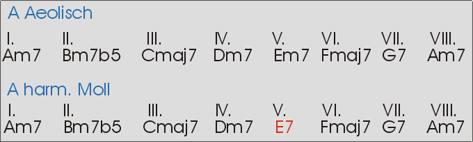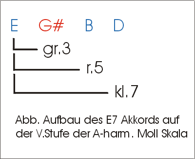 Das "G#" sorgt dafür, dass sich auf der V.Stufe der harmonischen Moll-Tonleiter ab sofort kein Moll7 Akkord mehr befindet, sondern ein lupenreiner Dominant-Sept Akkord - hier namentlich ein saftiger E7er. |