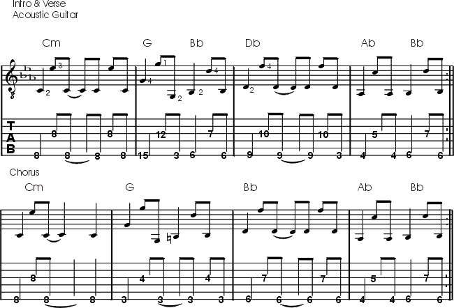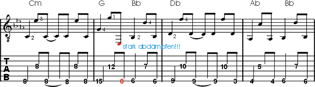 ÜBRIGENS: Das Teil ist gar nicht so leicht zu spielen. Achte auf jeden Fall, auf den im Notentext angegebenen Fingersatz. Besonders der schnelle Wechsel in den 12.-, und 15. Bund (Takt 1)und der nachfolgende Abstieg in Bund.3, können Probleme bereiten. Wir vermuten, dass Daron seine Akustik um einen Ganzton runtergestimmt hat, alle hier angegebenen Akkorde also zwei Bünde höher platziert zum besten gibt und so das "brutale G" (3.Bd/E-Saite) im zweiten Takt der Nummer, als "leere" umgestimmte A-Saite spielt. Das Ganze ist aber, wie du hörst, auch im Standard-Tuning machbar. Fall du dennoch Probleme haben solltest, kannst du das G auch weglassen und stattdessen die stark abgedämpfte offene E-Saite spielen. Das klingt kam anders, erleichtert das Spiel der Nummer aber kollosal. |