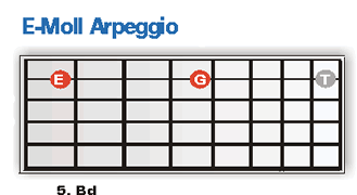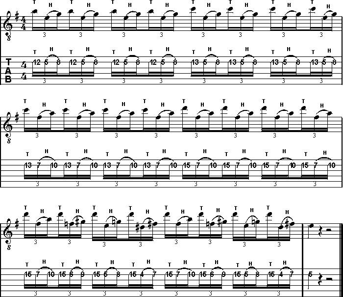 Viele Tapping Lix des jungen Van Halen basieren auf Arpeggien- gebrochen gespielten Akkorden. Der legendäre Song Eruption ist ein gutes Beispiele für diesen Ansatz. Unsere nächste Studie basiert auf der Akkordfolge der Nummer und stellt die ideale Übung für Tapping- Novizen dar.
