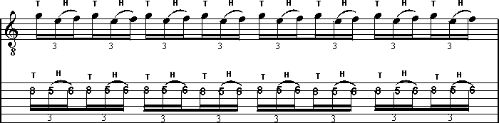 PG Workshop Special Tapping-Part IIIvon Hansi Tietgen Guten Morgen! Willkommen zum dritten Teil unseres großen Tapping Specials. In der aktuellen Ausgabe wirst du nicht nur erfahren, wie du die bisher gelernten Pattern in Verbindung mit Dur/Moll Skalen einsetzen kannst, sondern auch, wie man aus einem "gemeinen" Sechzehntel-Triolen Lick ein cooles Sechzehntel- bzw. (wer kann) Zweiunddreißigstel-Pattern bastelt. Viel Vergnügen! Auch diesmal wollen wir dich, in gewohnter Weise, zunächst mit einem passenden Grund-Pattern versorgen. Es basiert auf Tönen der C-Dur/A-Moll Skala und entspricht in seinem Ablauf unserem althergebrachten Tapping-Lick aus Folge Numero Uno. TAP 3 Basis-Pattern hören