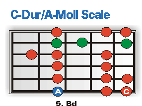 Wie eben schon erwähnt, entstammt die verwendete Tonfolge (grün eingefärbt) der C-Dur/A-Moll Skala: