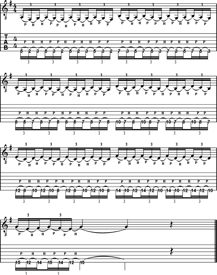 PG Workshop Special Tapping-Part IV Seite 2/2Und die Legato-Technik kann noch mehr. Dank ihres smoothen Sounds eignet sich die Technik ideal zum Verbinden einzelner Skalenpositionen. Hörīdir mal die folgende Studie an!