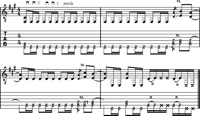 Durch das recht hohe Spieltempo (bpm= 136) ist eine rhythmisch präzise Umsetzung des Riffs gar nicht so einfach. Neben den verwendeten 16'tel Pattern, die du am besten mit der angegebenen Wechselschlag-Technik spielst, sind es besonders die Powerchord-Slides in den Takten 3 und 4, die Schwierigkeiten bereiten können. Intensives SloMo Training wirkt in dieser Hinsicht aber Wunder.