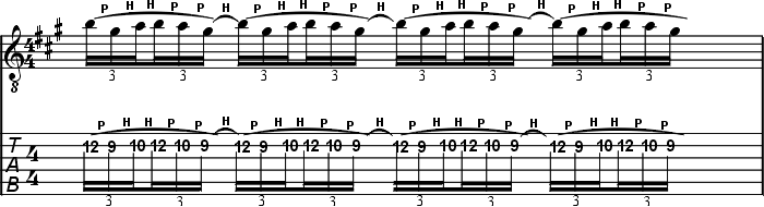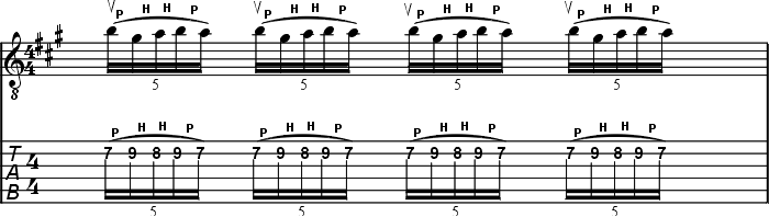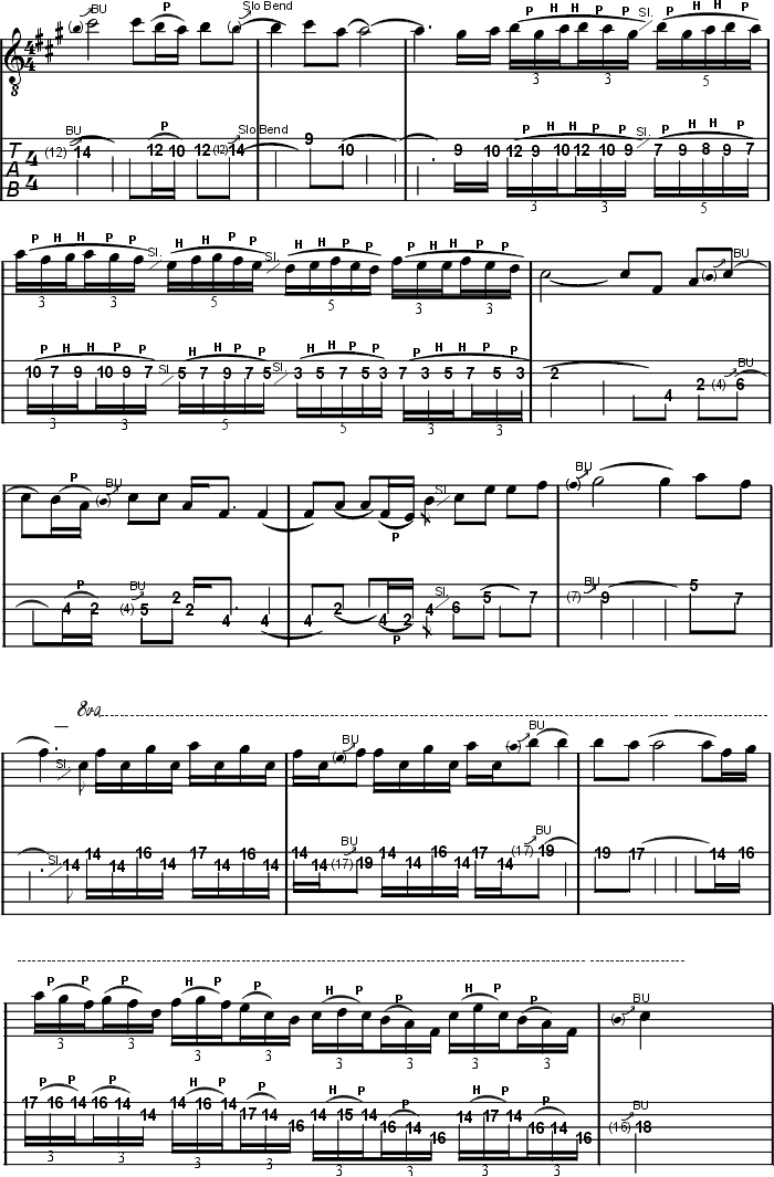 Die AnalyseDas Solo startet mit einem relativ gemütlichen Bending Lick in der 9. Lage. Wichtig für die Wirkung des Parts ist die relaxte Ausführung des Slo Bends auf der "4+" des ersten Taktes. Dabei startest du dein Bending auf eben dieser Zählzeit und nutzt die gesamte erste Viertel des zweiten Takts um dich langsam dem entgültigen Zielton (C#) zu näheren. Richtig ans Eingemachte geht es dann im dritten Takt der Studie. Die lichtschnelle Legato-Linie fordert den ganzen Gitarristen, macht dafür aber richtig was her. Üben lohnt sich also! TIPP: Falls du mehr zum Thema Legatospiel erfahren willst, empfehlen wir dir die Lick der Woche Ausgaben #12 und #17 sowie den vierten Teil unseres Tapping Workshops. Besonders wichtig für eine entspannte Performance der Linie, ist die Fähigkeit den Wechsel zwischen Sechzehteltriolen und Quintolen perfekt vollziehen zu können. Da wir an dieser Stelle das Rad nicht neu erfinden wollen, möchten wir dir einmal mehr den LIWO #17 ans Herz legen. Anhand einiger fetter Steve Lukather Lix liefert der nette Workshop dir alle Infos die du benötigst, um ein 1A Quintolen-Versteher zu werden. Grob betrachtet besteht der Lauf aus nur zwei Teilen (und einer kleine Variation am Ende des Laufs).