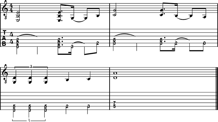 Das Riff arbeitet mit einer illustren Mischung aus Standard-Powerchords und Singlenote-Passagen. Dabei rekrutieren sich sowohl die Chords als auch die verwendeten Einzeltöne aus einer Skala, die von Fach-Chinesen als phrygisches Mode bzw. phrygische Kirchentonleiter bezeichnet wird (E Phrygisch).